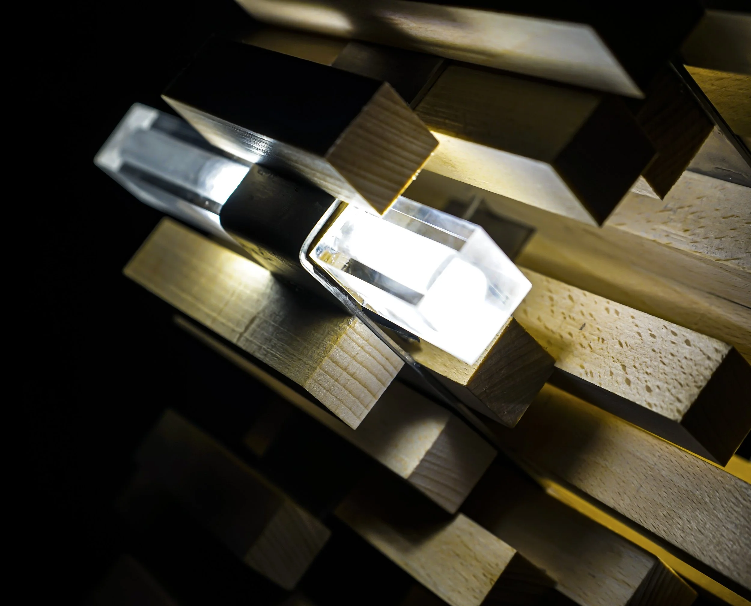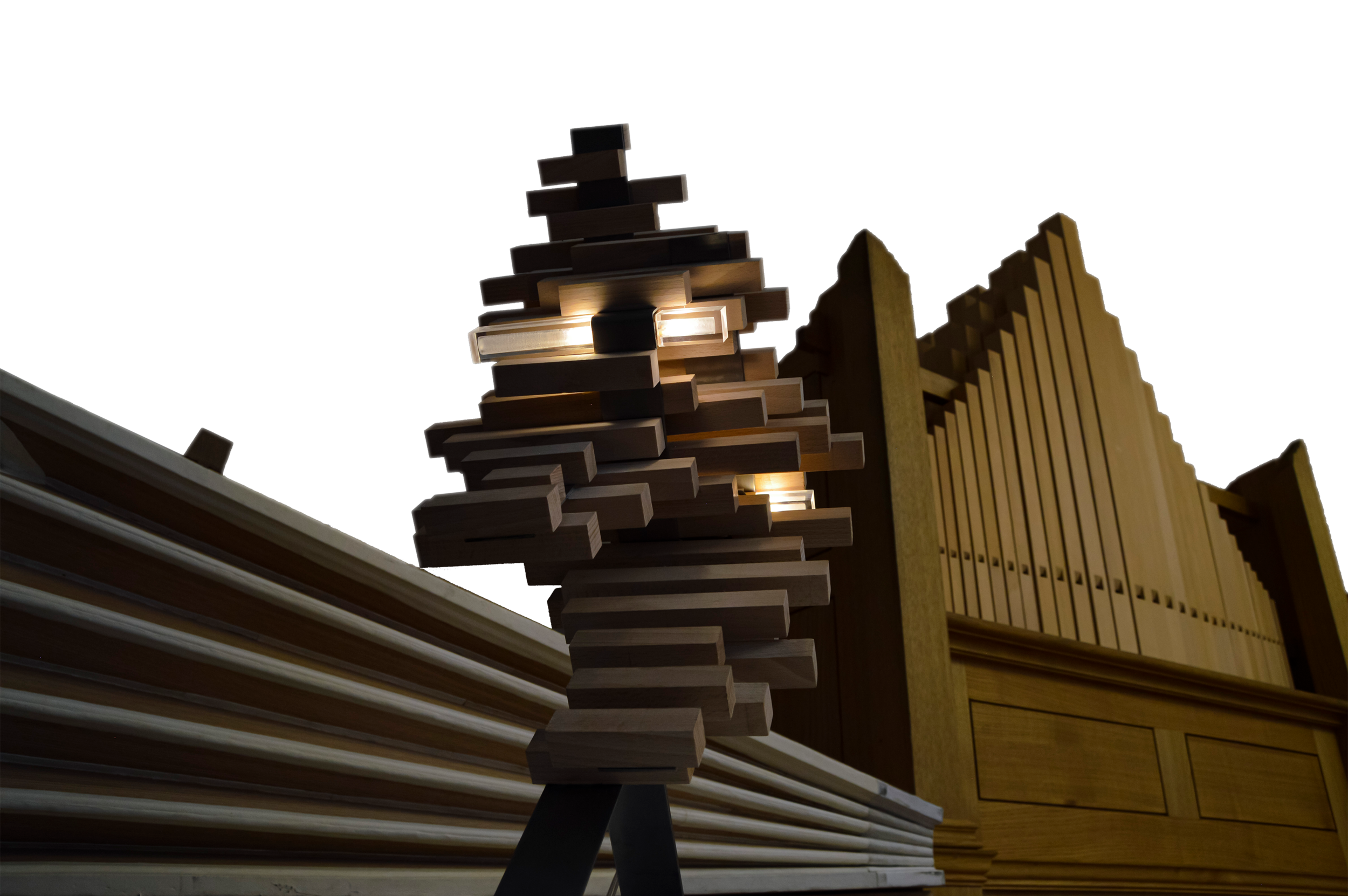 Die Steuerung der Lampe ist der Partitur inbegriffen. Die Materialien Holz und Edelstahl prägen das Erscheinungsbild der Lampe und werden separat klanglich eingebunden.